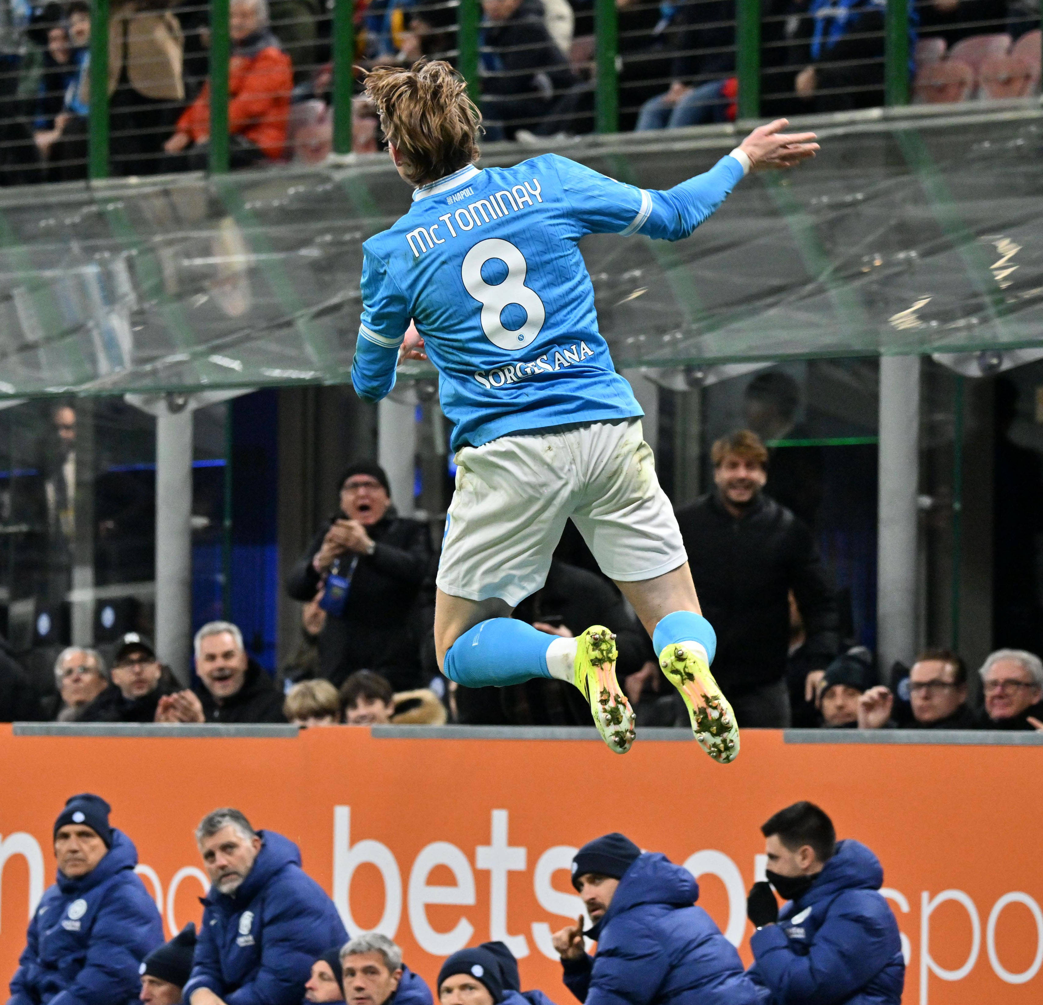 1月11日,那不勒斯队球员麦克托米奈庆祝进球。 新华社发(阿尔贝托·林格利亚摄)