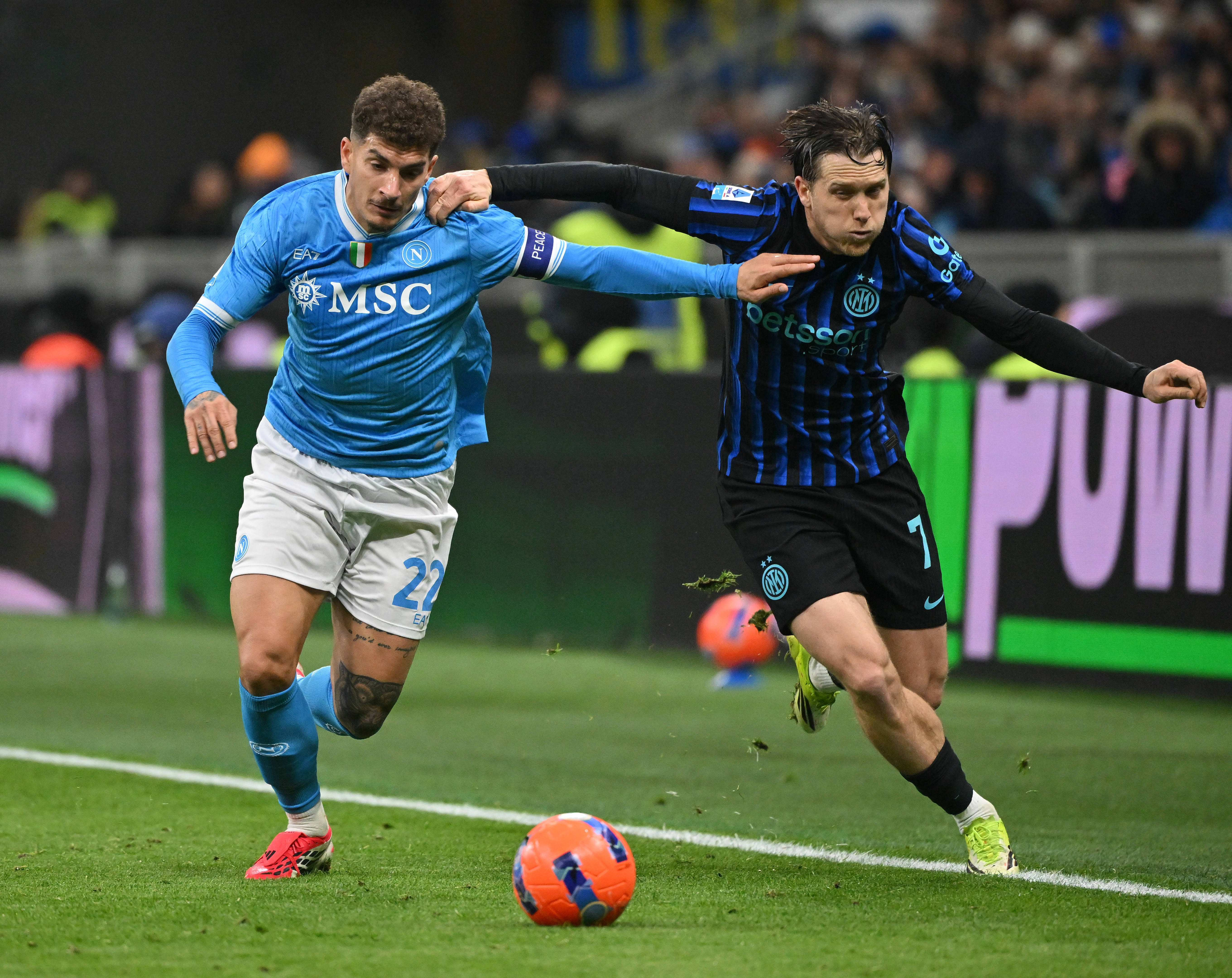 1月11日,国际米兰队球员泽林斯基(右)与那不勒斯队球员迪洛伦佐在比赛中拼抢。 新华社发(阿尔贝托·林格利亚摄)