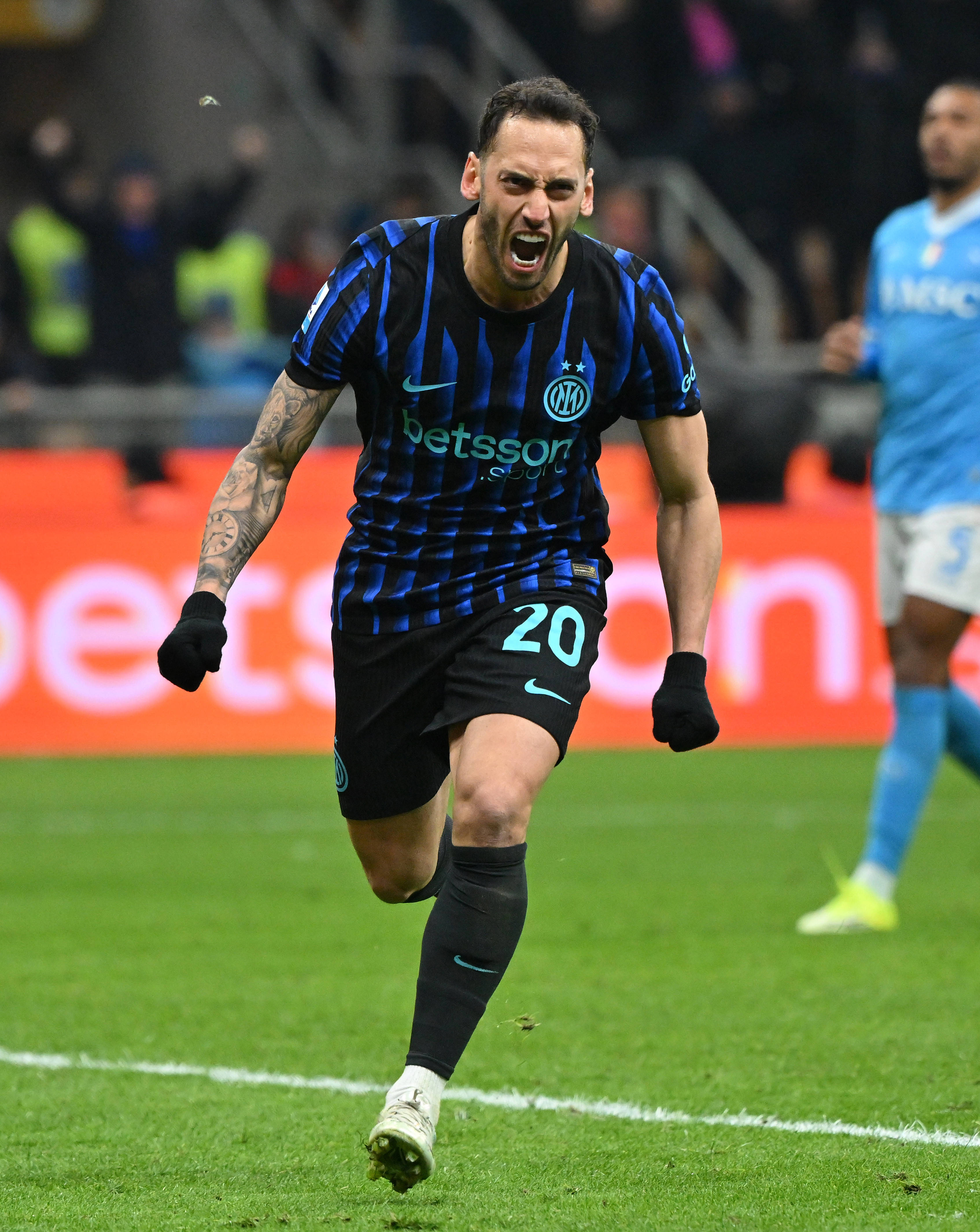 1月11日,国际米兰队球员恰尔汗奥卢庆祝进球。 新华社发(阿尔贝托·林格利亚摄)