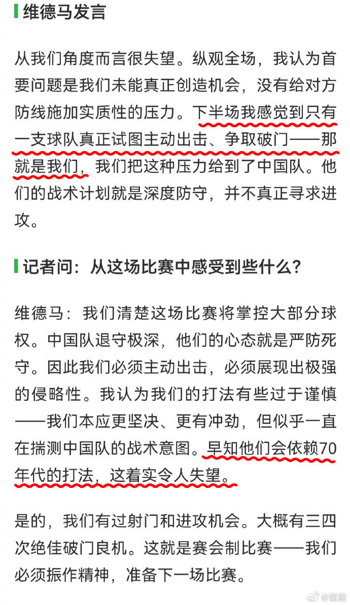 赛后,澳大利亚主帅质疑U23国足退守很深,他们战术就是深度防守,并不真正寻求进攻。维德马炮轰U23国足依赖70年代的打法,这着实令人失望!