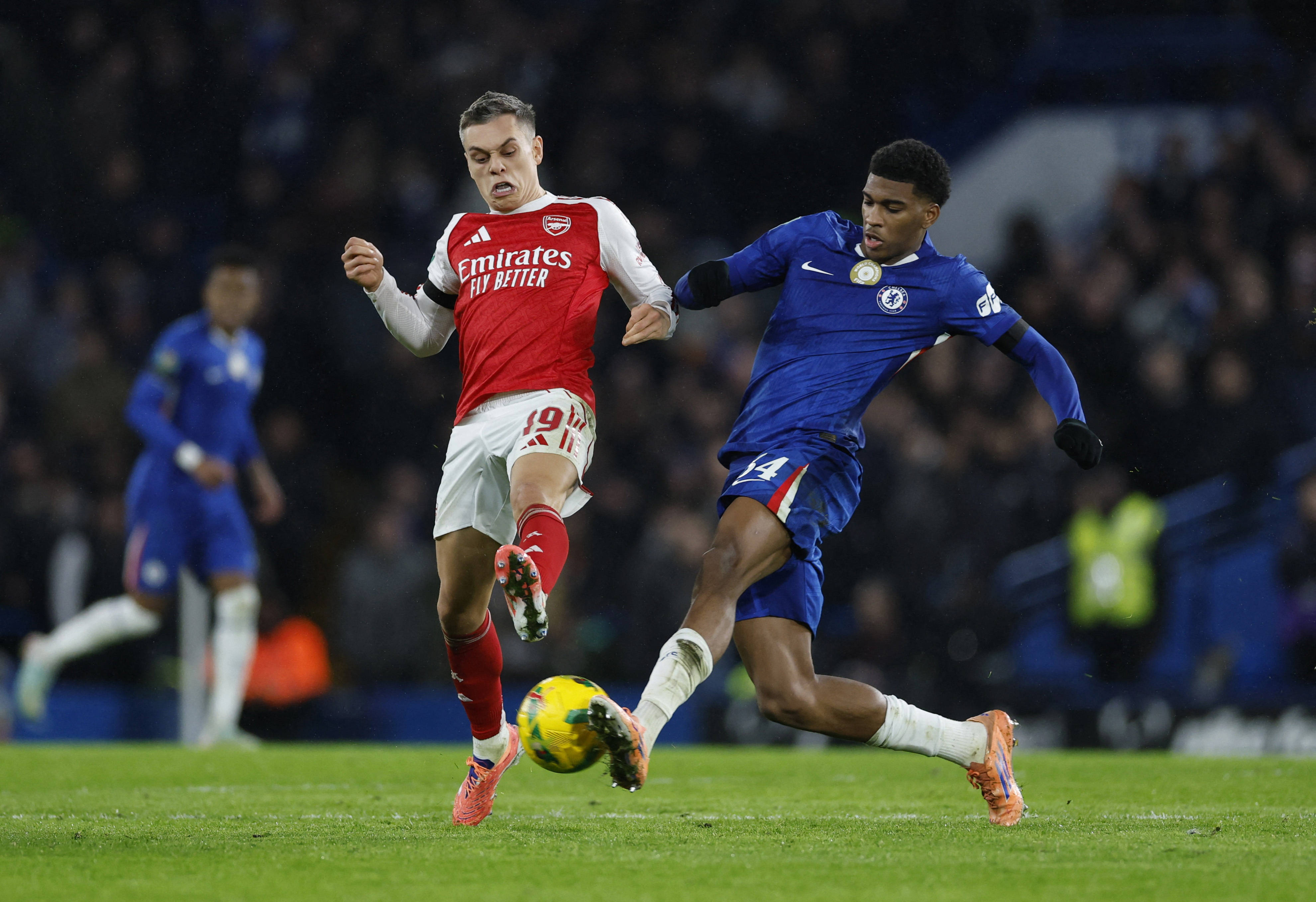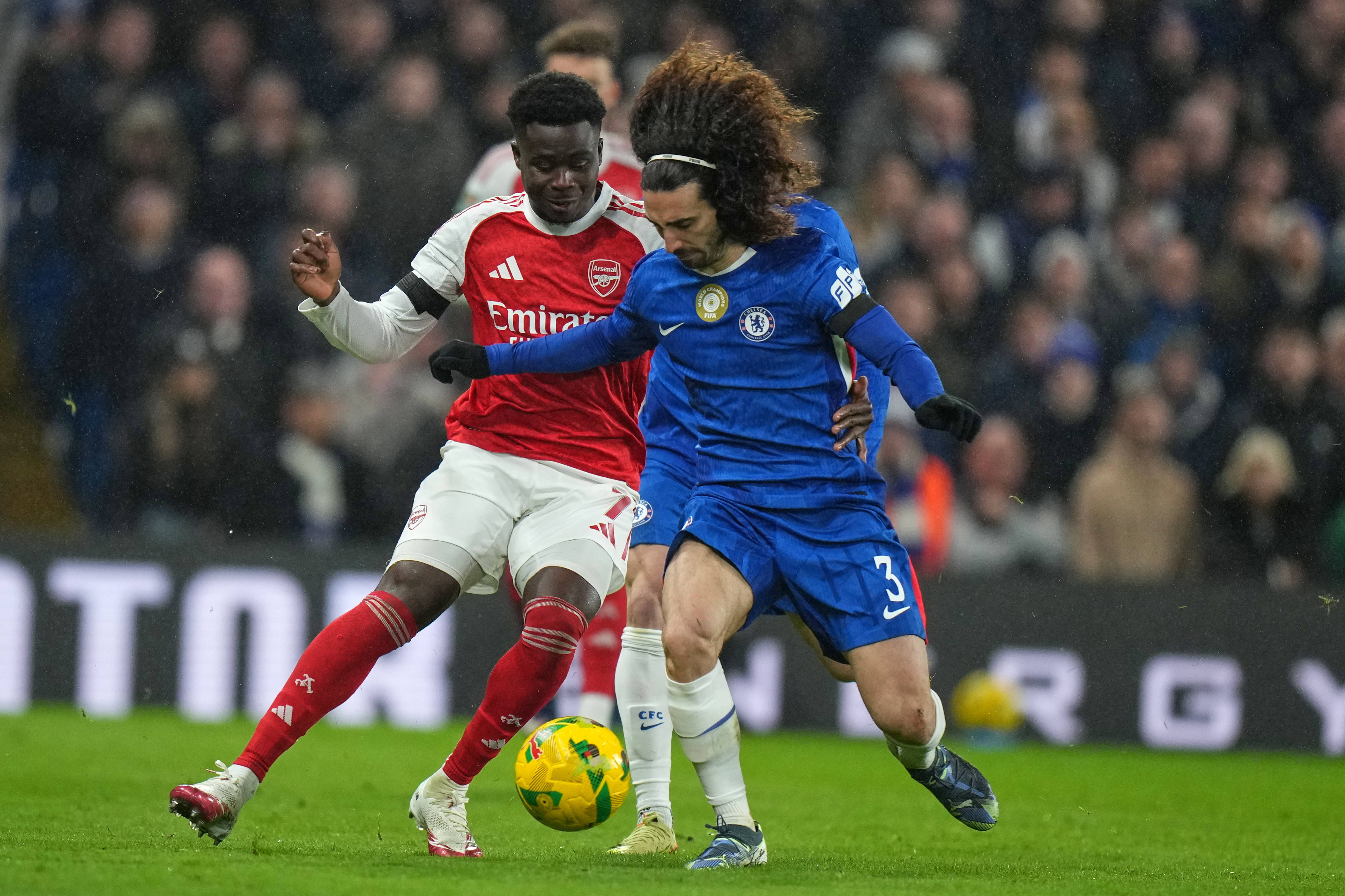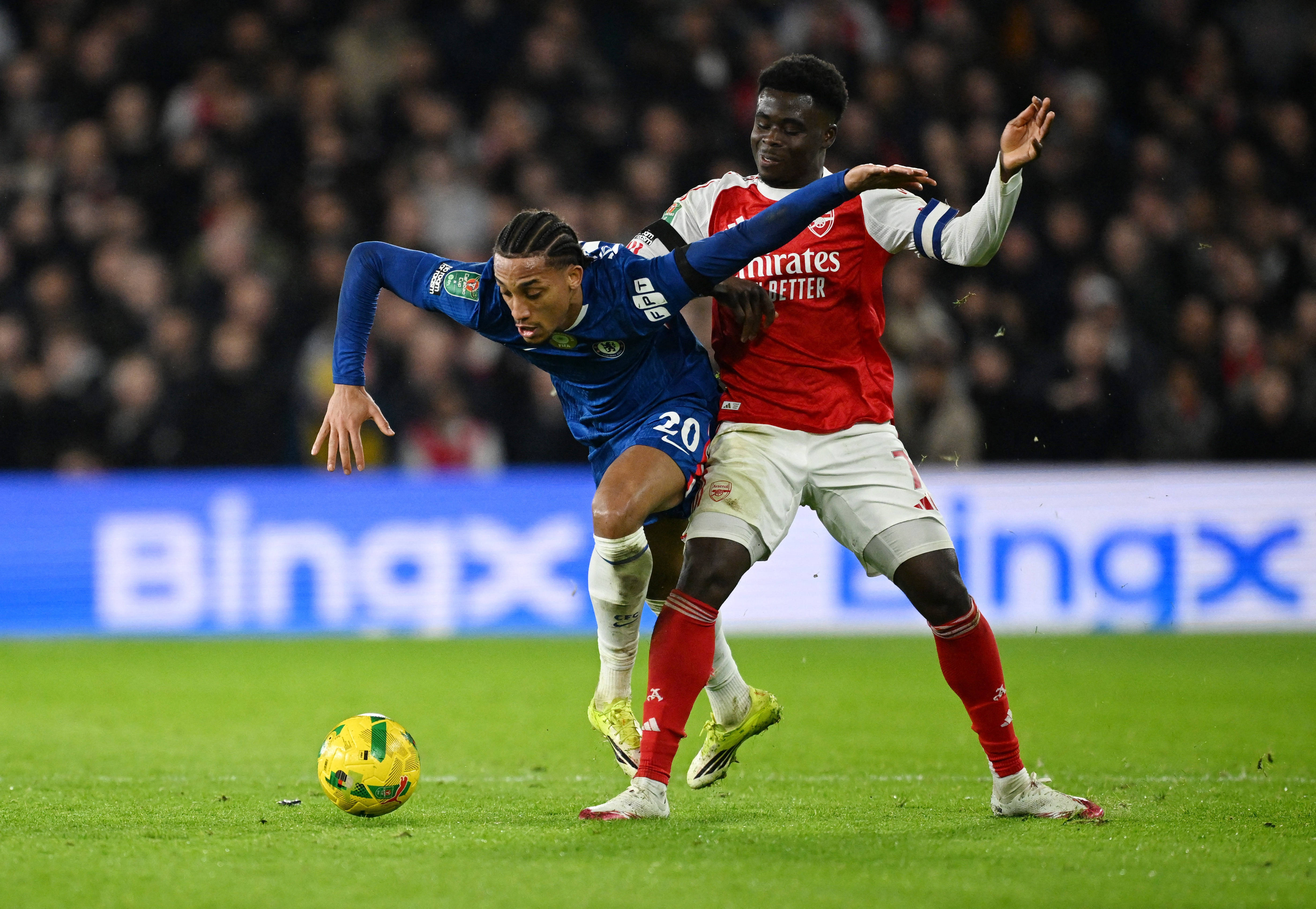 1月14日,切尔西队球员库库雷利亚(右)和阿森纳队球员萨卡在比赛中拼抢。 新华社/美联