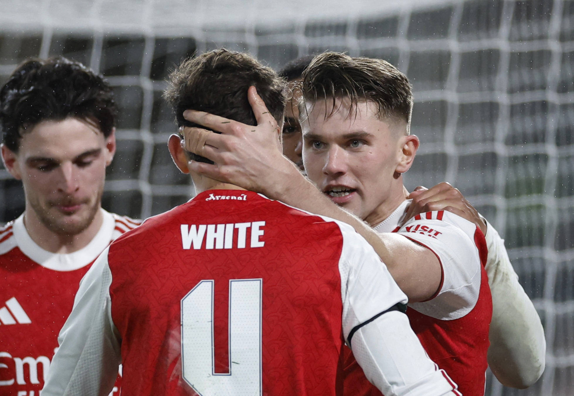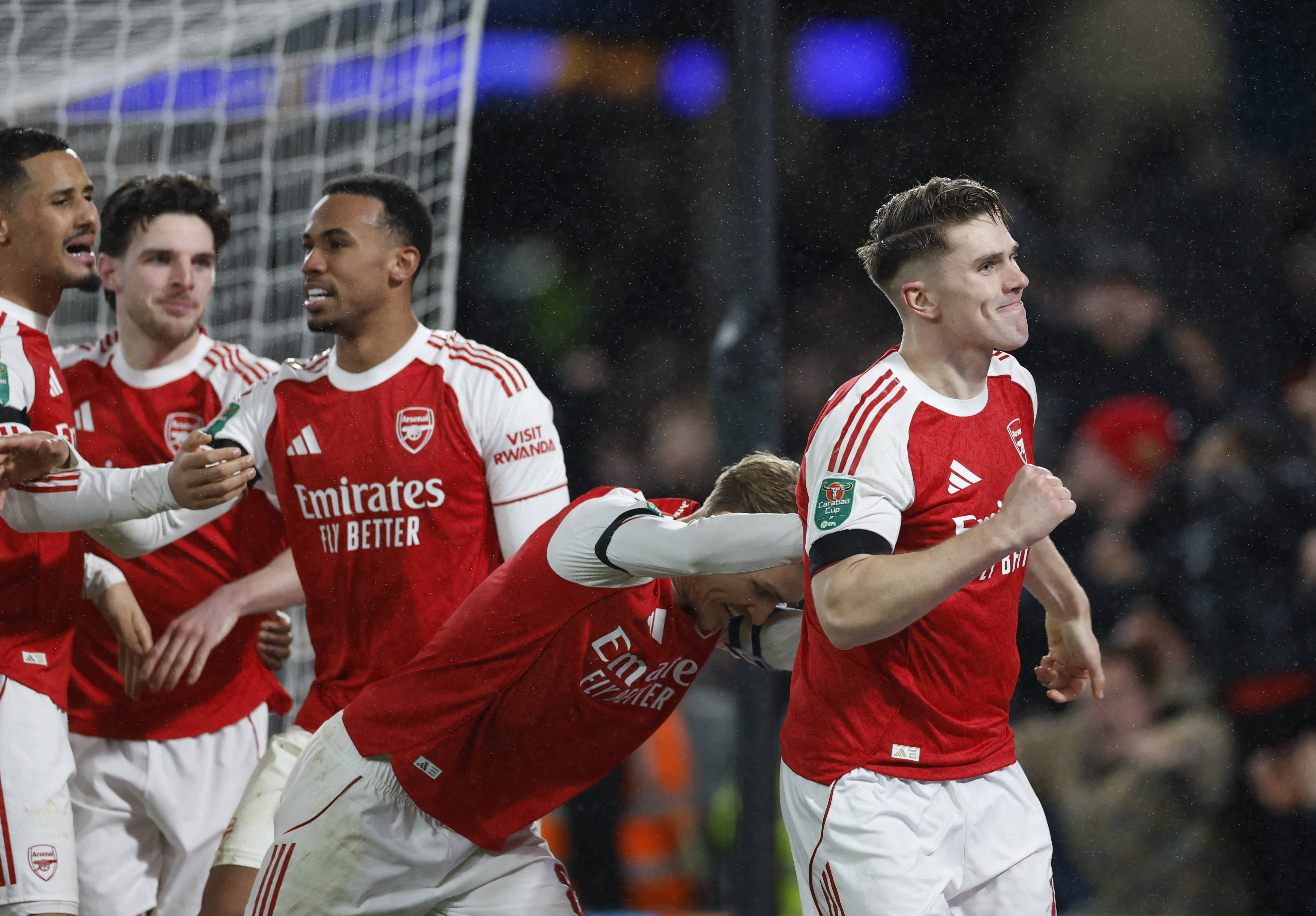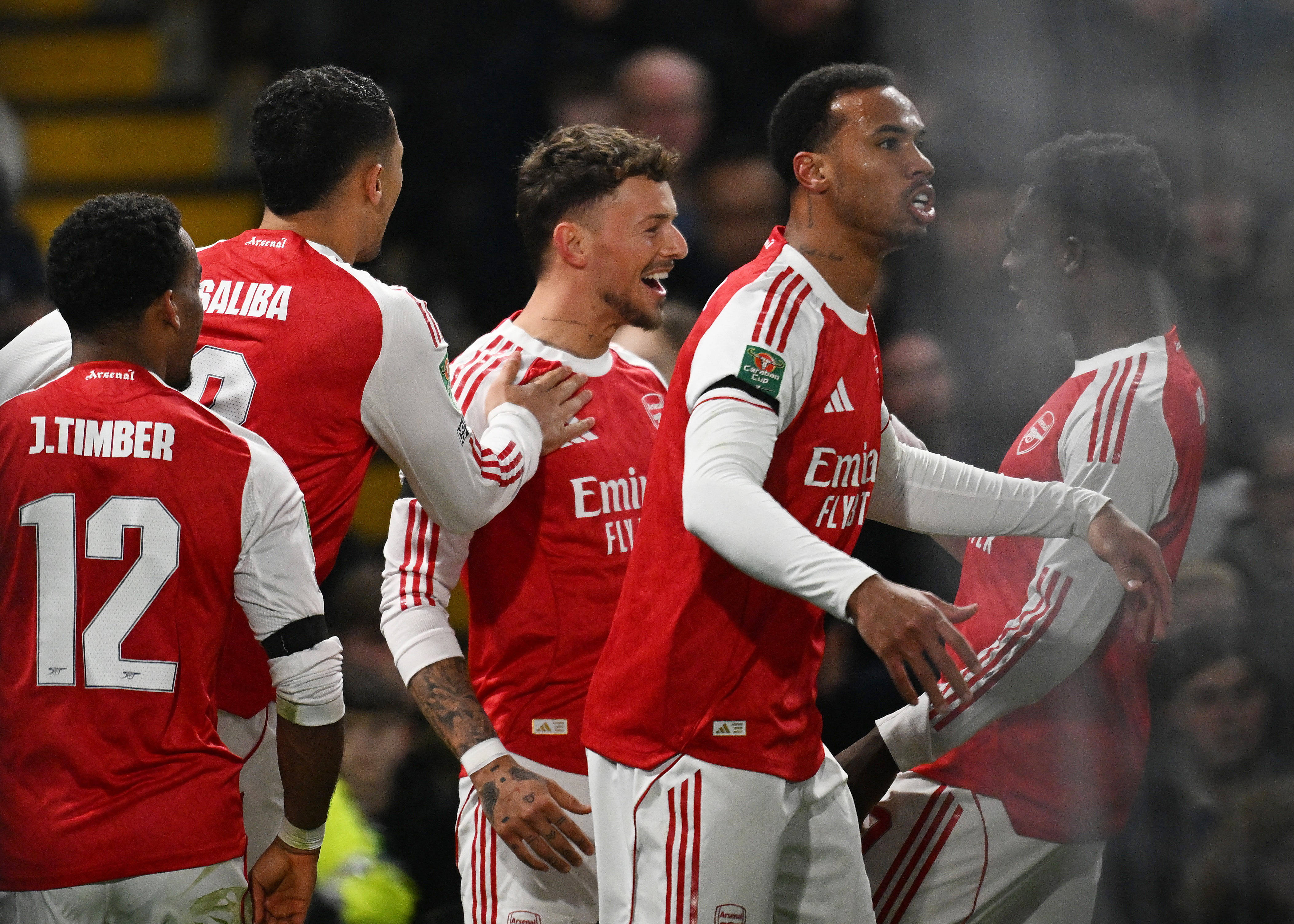 1月14日,阿森纳队球员本·怀特(中)和队友庆祝攻入球队首球。 新华社/路透