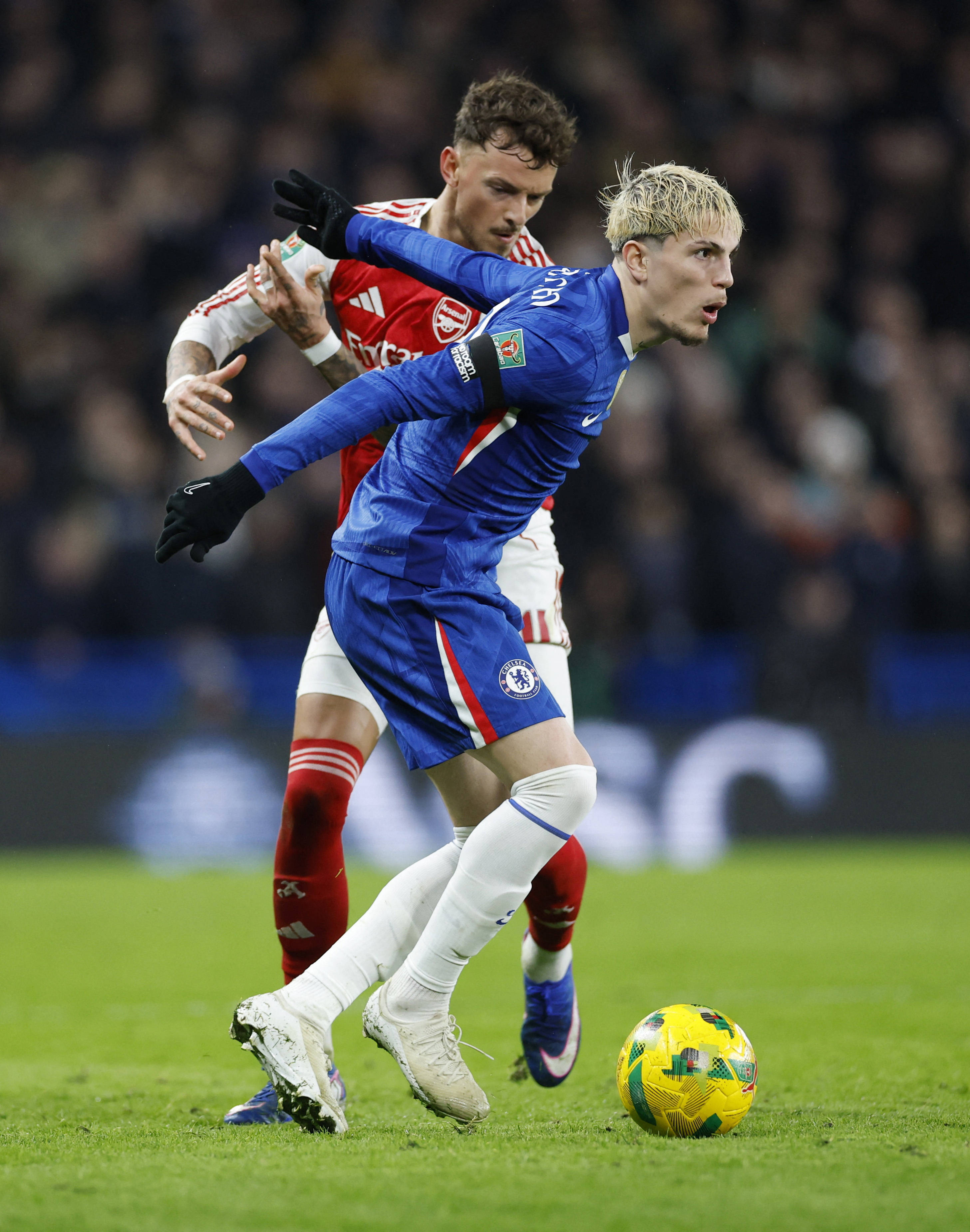 1月14日,切尔西队球员加纳乔(前)和阿森纳队球员本·怀特在比赛中拼抢。 新华社/路透