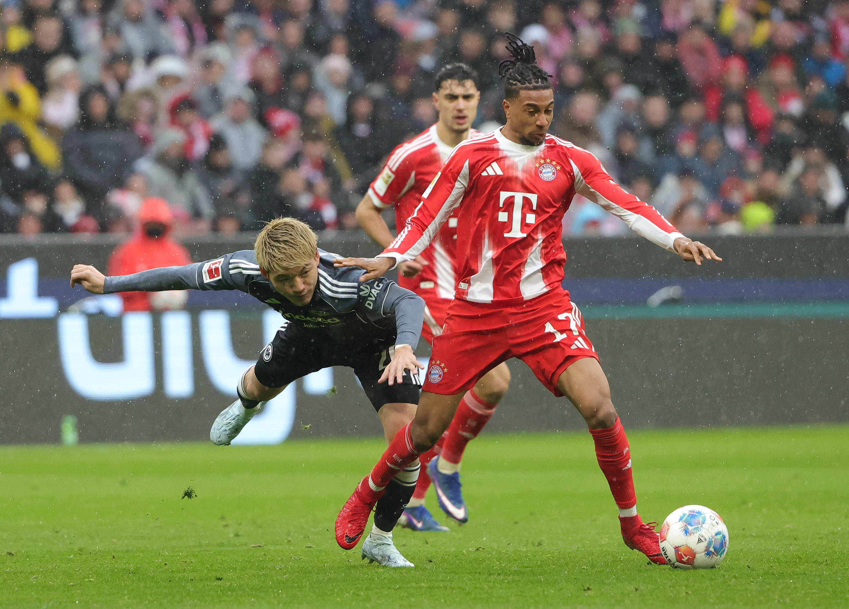 2月21日,拜仁慕尼黑队球员奥利塞(右)和法兰克福队球员堂安律(左)在比赛中拼抢。 新华社发(菲利普·鲁伊兹摄)