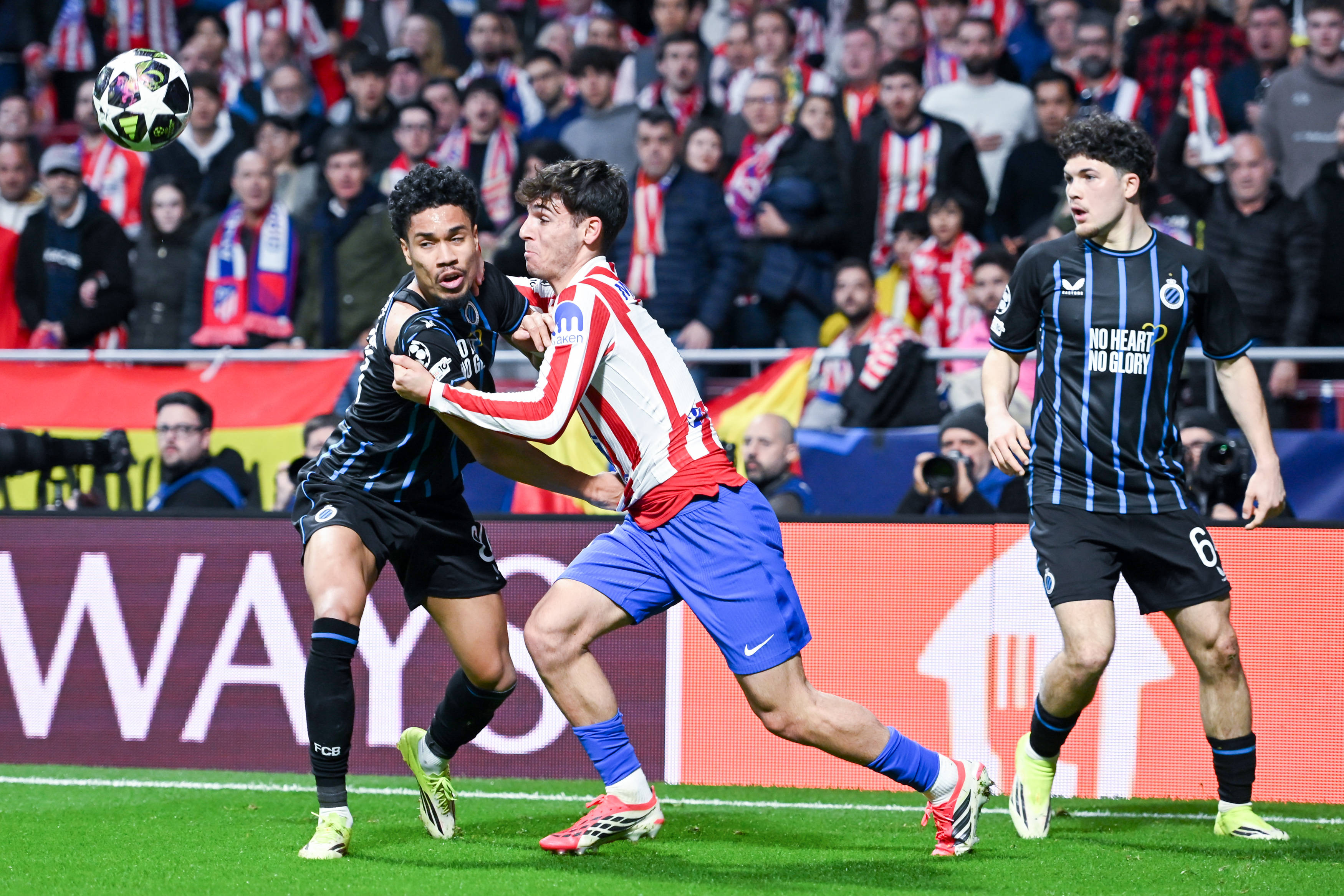 2月24日,马德里竞技队球员略伦特(左)与布鲁日队球员佐利斯在比赛中拼抢。 新华社发(古斯塔沃·巴连特摄)