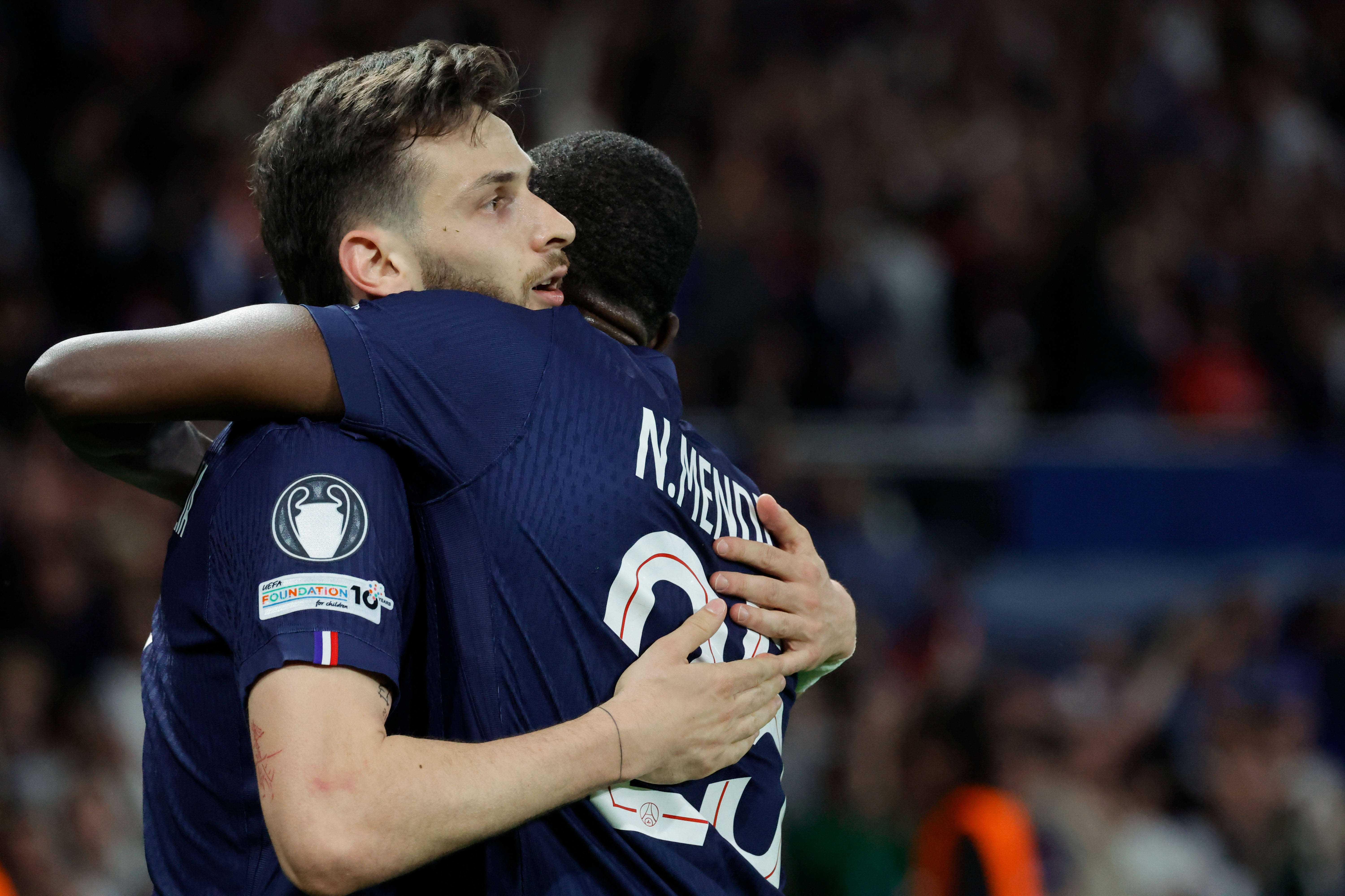 4月8日,巴黎圣日耳曼队球员克瓦拉茨赫利亚(左)在进球后与队友门德斯庆祝。 新华社发(亨利·施瓦茨摄)