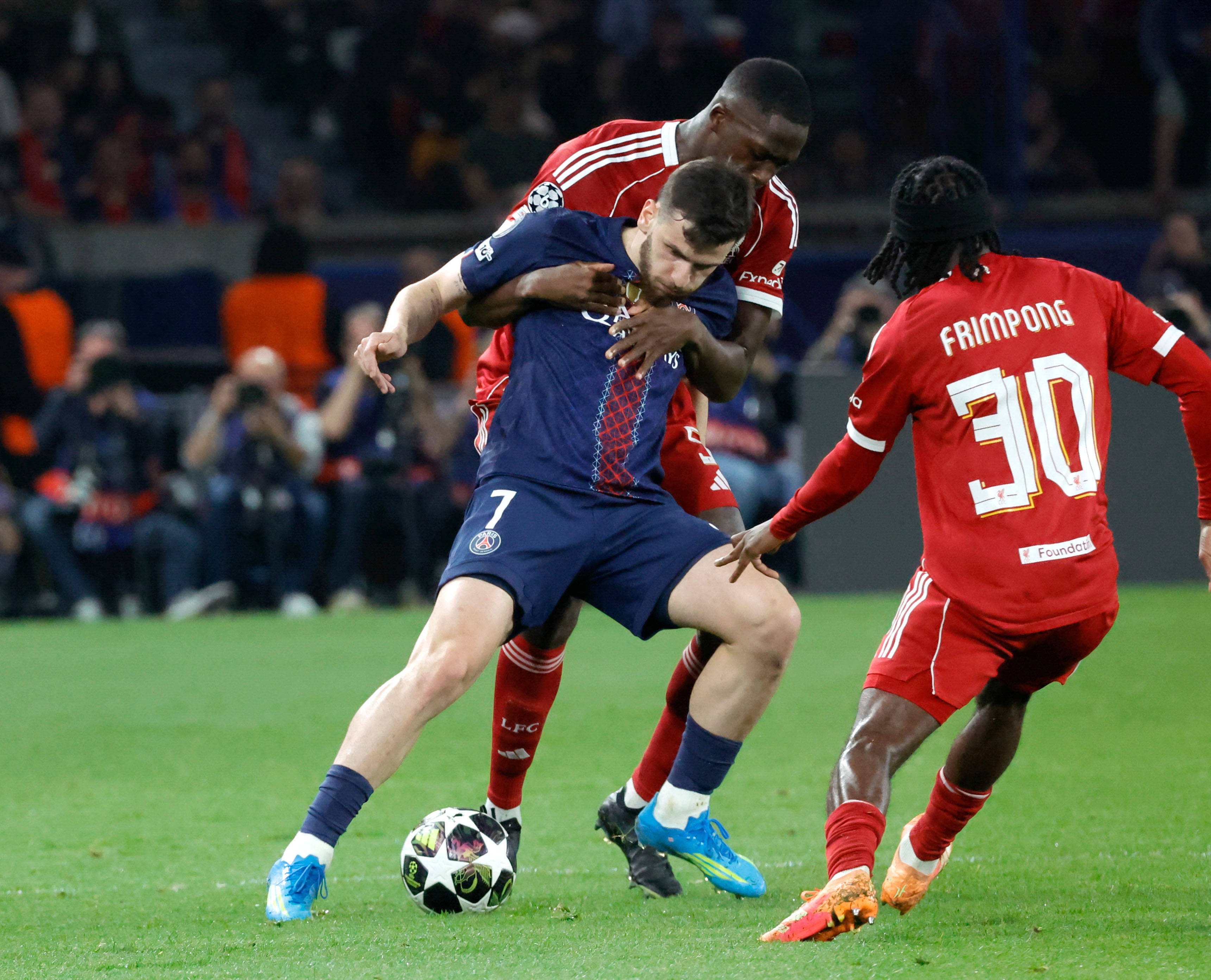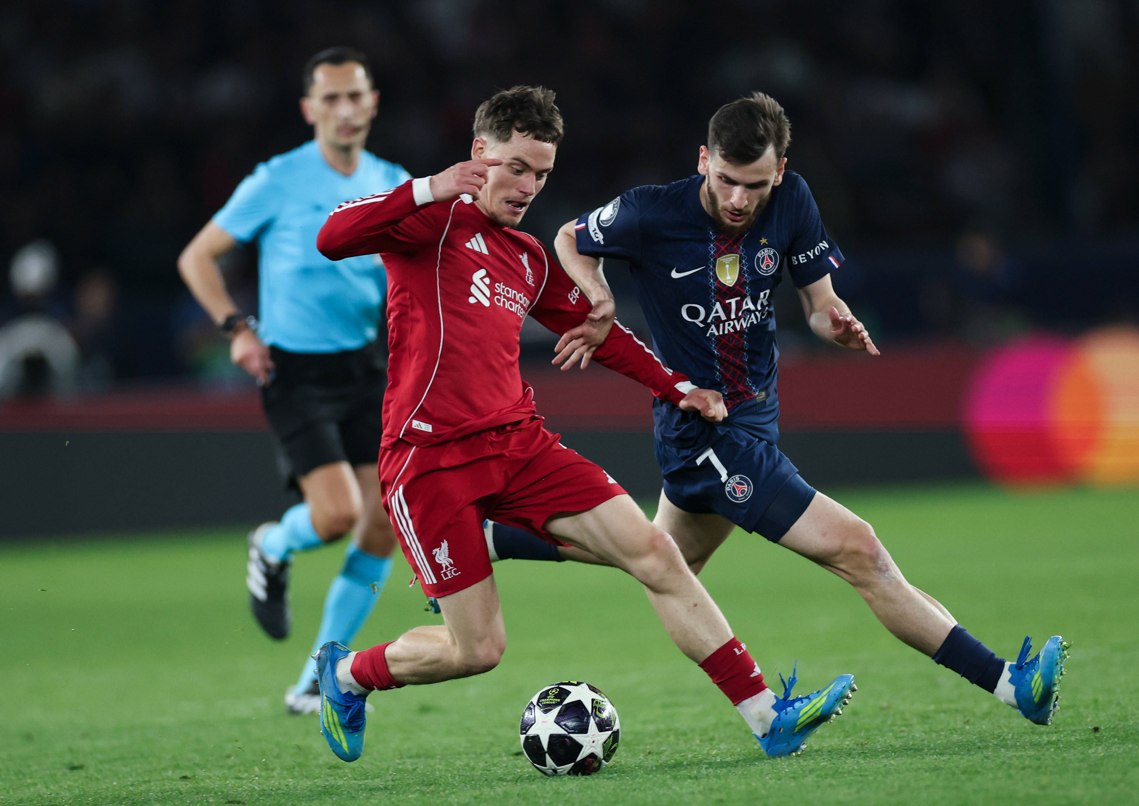 4月8日,巴黎圣日耳曼队球员克瓦拉茨赫利亚(右)和利物浦队球员维尔茨在比赛中争抢。 新华社记者 邬惠我 摄
