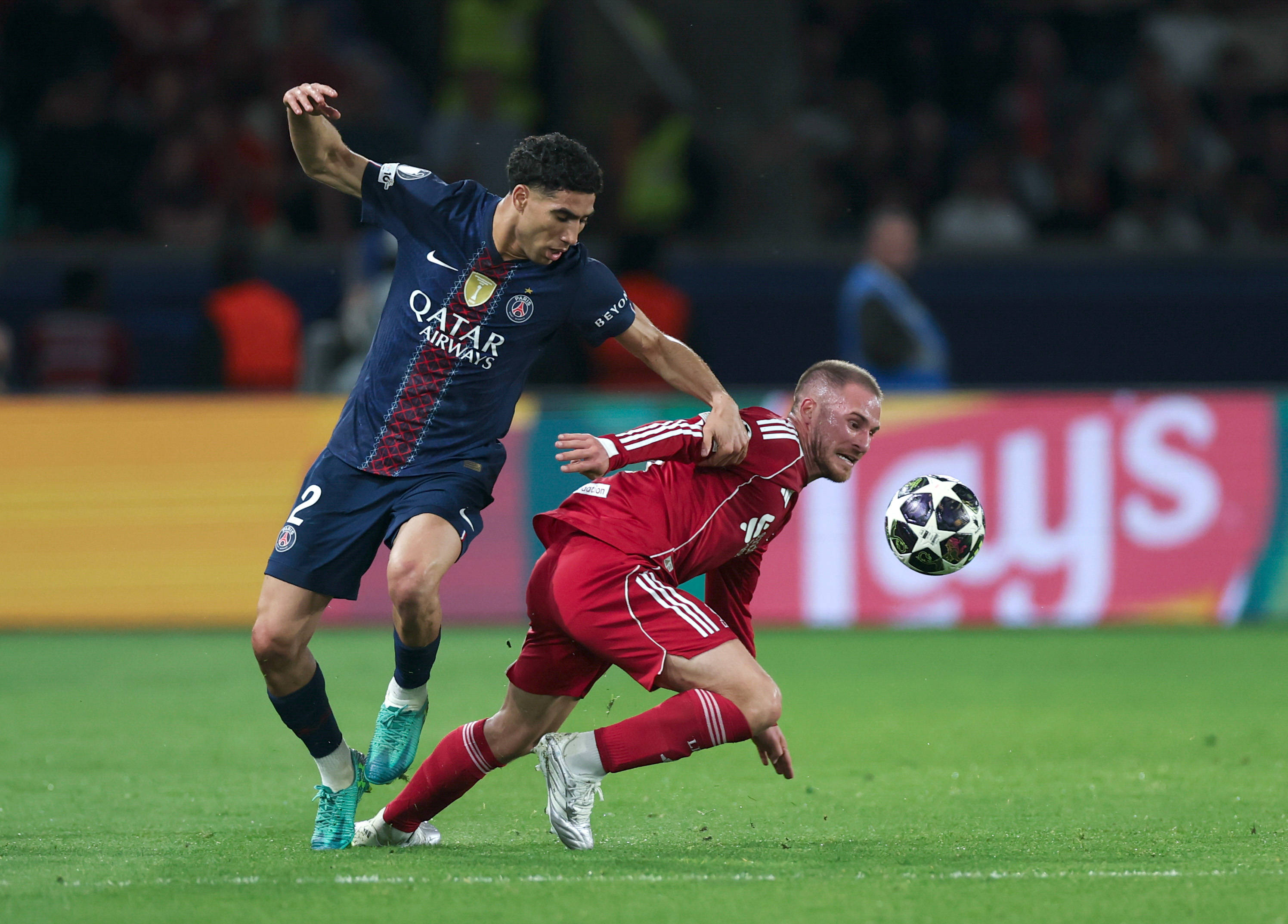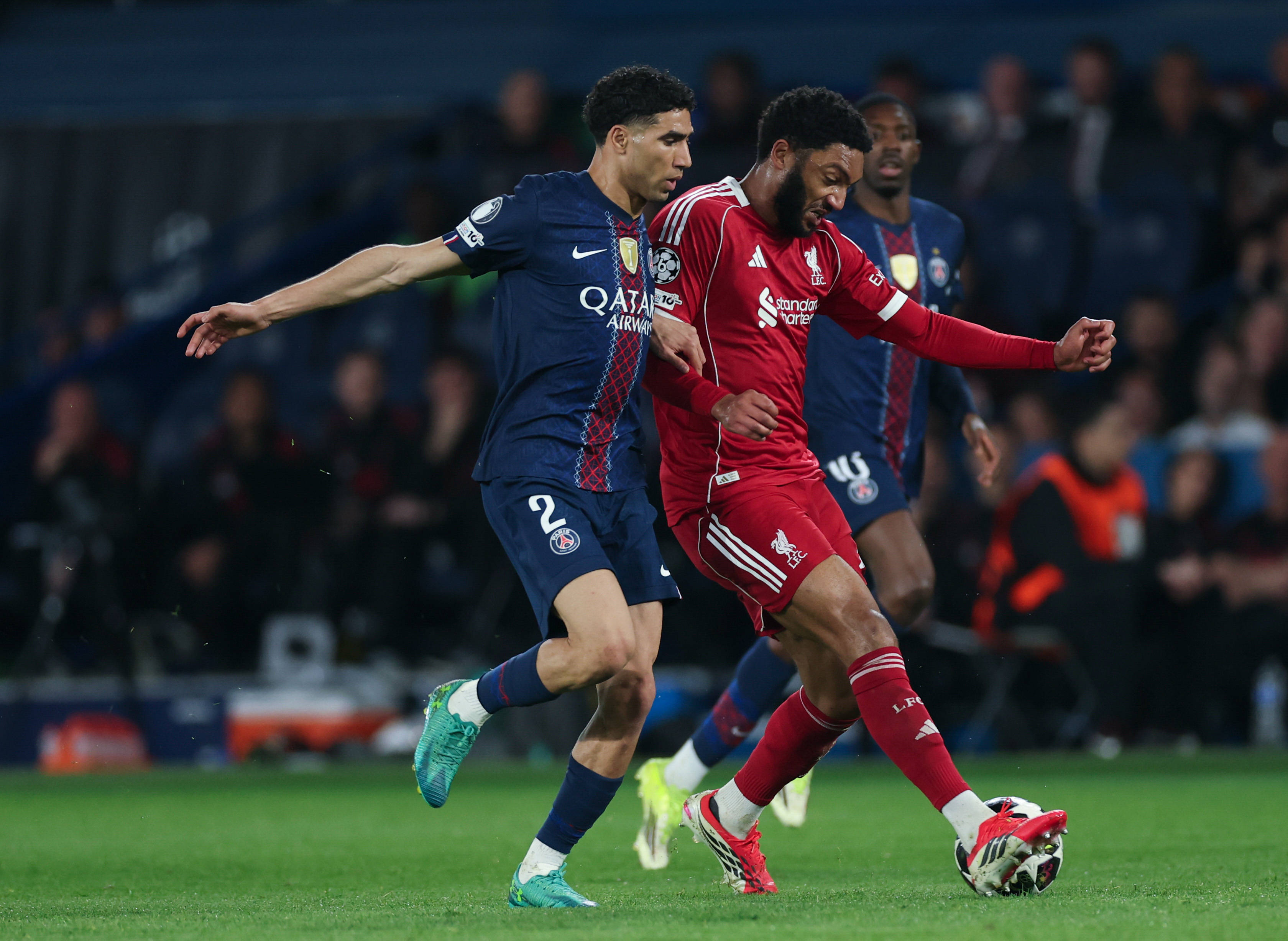 4月8日,巴黎圣日耳曼队球员阿什拉夫·哈基米(左)和利物浦队球员乔·戈麦斯在比赛中争抢。 新华社记者 邬惠我 摄