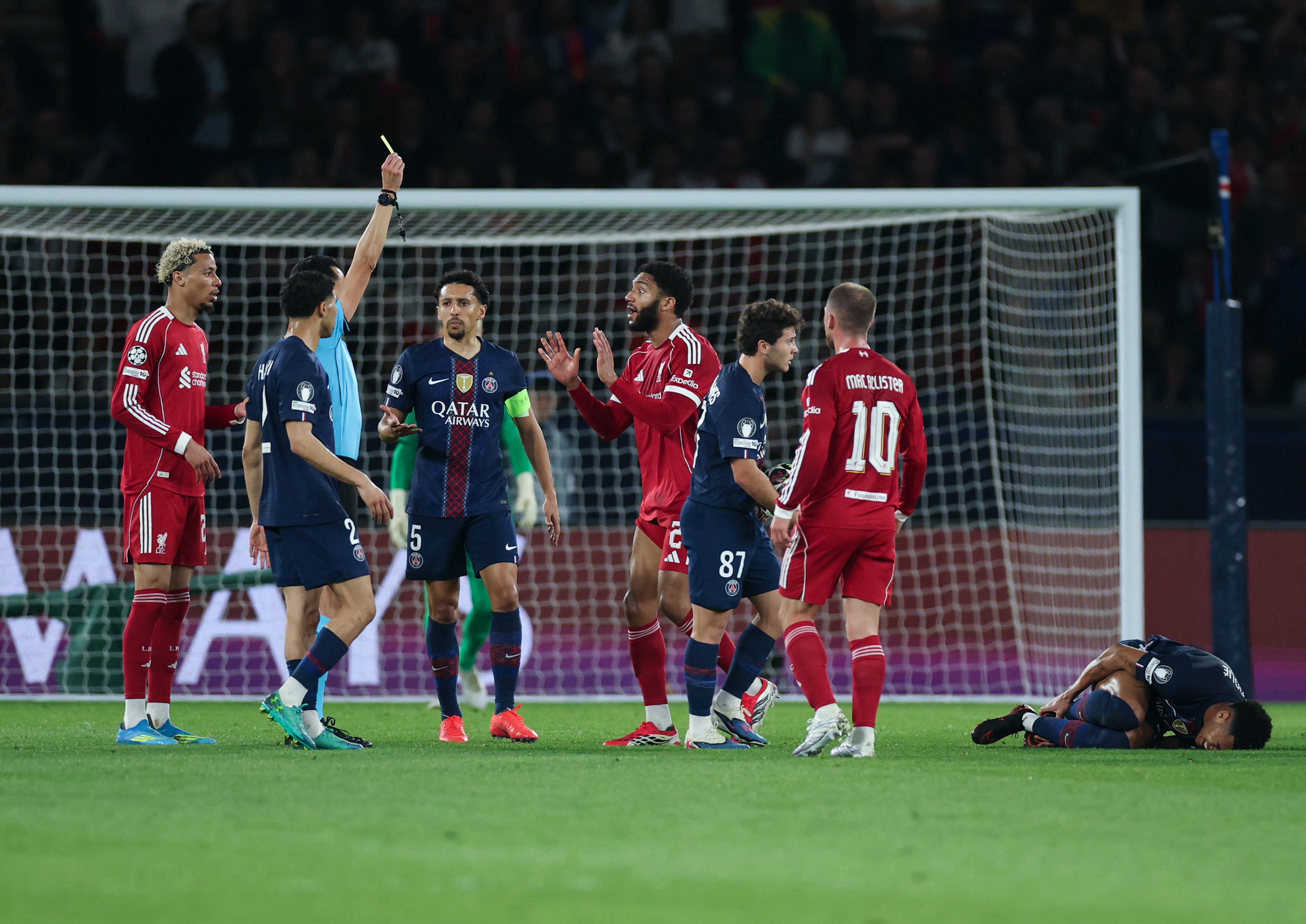 4月8日,主裁判向利物浦队球员乔·戈麦斯(右四)出示黄牌。 新华社记者 邬惠我 摄